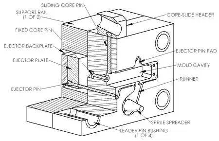 Other die components include cores and slides. Cores are components that usually produce holes or opening, but they can be used to create other details as well. There are three types of cores: fixed, movable, and loose. Fixed cores are ones that are oriented parallel to the pull direction of the dies (i.e. the direction the dies open), therefore they are fixed, or permanently attached to the die. Movable cores are ones that are oriented in any other way than parallel to the pull direction. These cores must be removed from the die cavity after the shot solidifies, but before the dies open, using a separate mechanism. Slides are similar to movable cores, except they are used to form undercut surfaces. The use of movable cores and slides greatly increases the cost of the dies.[17] Loose cores, also called pick-outs, are used to cast intricate features, such as threaded holes. These loose cores are inserted into the die by hand before each cycle and then ejected with the part at the end of the cycle. The core then must be removed by hand. Loose cores are the most expensive type of core, because of the extra labor and increased cycle time.[11] Other features in the dies include water-cooling passages and vents along the parting lines. These vents are usually wide and thin (approximately 0.13 mm or 0.005 in) so that when the molten metal starts filling them the metal quickly solidifies and minimizes scrap. No risers are used because the high pressure ensures a continuous feed of metal from the gate.[18]
