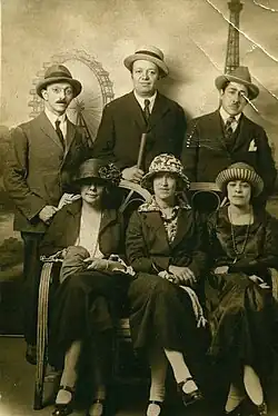 From there he went to Paris, a destination for young European and American artists and writers, who settled in inexpensive flats in Montparnasse. His circle frequented La Ruche, where his Italian friend Amedeo Modigliani painted his portrait in 1914.[12] His circle of close friends included Ilya Ehrenburg, Chaïm Soutine, Modigliani and his wife Jeanne Hébuterne, Max Jacob, gallery owner Léopold Zborowski, and Moise Kisling. Rivera's former lover Marie Vorobieff-Stebelska (Marevna) honored the circle in her painting Homage to Friends from Montparnasse (1962).[13]