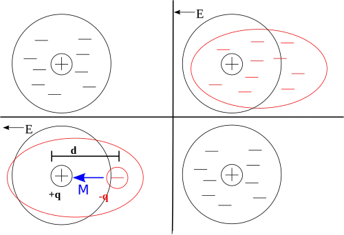 In the classical approach to the dielectric, the material is made up of atoms. Each atom consists of a cloud of negative charge (electrons) bound to and surrounding a positive point charge at its center. In the presence of an electric field, the charge cloud is distorted, as shown in the top right of the figure.