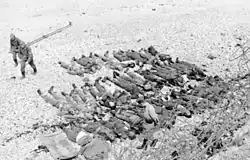Unaware of the situation on the beaches because of a smoke screen laid by the supporting destroyers, Major General Roberts sent in the two reserve units: the Fusiliers Mont-Royal and the Royal Marines. At 07:00, the Fusiliers under the command of Lieutenant Colonel Dollard Ménard in 26 landing craft sailed towards their beach. They were heavily engaged by the Germans, who hit them with heavy machine gun, mortar and grenade fire, and destroyed them; only a few men managed to reach the town.[12] Those men were then sent in towards the centre of Dieppe and became pinned down under the cliffs and Roberts ordered the Royal Marines to land in order to support them. Not being prepared to support the Fusiliers, the Royal Marines had to transfer from their gunboats and motorboat transports onto landing craft. The Royal Marine landing craft were heavily engaged on their way in with many destroyed or disabled. Those Royal Marines that did reach the shore were either killed or captured. As he became aware of the situation the Royal Marine commanding officer Lieutenant Colonel Phillipps, stood upon the stern of his landing craft and signalled for the rest of his men to turn back. He was killed a few moments later.[26]