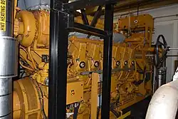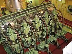 The diesel engine has the highest thermal efficiency (see engine efficiency) of any practical internal or external combustion engine due to its very high expansion ratio and inherent lean burn, which enables heat dissipation by excess air. A small efficiency loss is also avoided compared with non-direct-injection gasoline engines, as unburned fuel is not present during valve overlap, and therefore no fuel goes directly from the intake/injection to the exhaust. Low-speed diesel engines (as used in ships and other applications where overall engine weight is relatively unimportant) can reach effective efficiencies of up to 55%.[1] The combined cycle gas turbine (Brayton and Rankine cycle) is a combustion engine that is more efficient than a diesel engine, but due to its mass and dimensions, is unsuitable for many vehicles, including watercraft and some aircraft. The world's largest diesel engines put in service are 14-cylinder, two-stroke marine diesel engines; they produce a peak power of almost 100 MW each.[2]