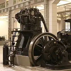 In February 1896, Diesel considered supercharging the third prototype.[46] Imanuel Lauster, who was ordered to draw the third prototype "Motor 250/400", had finished the drawings by 30 April 1896. During summer that year the engine was built, it was completed on 6 October 1896.[47] Tests were conducted until early 1897.[48] First public tests began on 1 February 1897.[49] Moritz Schröter's test on 17 February 1897 was the main test of Diesel's engine. The engine was rated 13.1 kW with a specific fuel consumption of 324 g·kW−1·h−1,[50] resulting in an effective efficiency of 26.2%.[51][52] By 1898, Diesel had become a millionaire.[53]