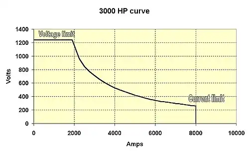 A locomotive's control system is designed so that the main generator electrical power output is matched to any given engine speed. Given the innate characteristics of traction motors, as well as the way in which the motors are connected to the main generator, the generator will produce high current and low voltage at low locomotive speeds, gradually changing to low current and high voltage as the locomotive accelerates. Therefore, the net power produced by the locomotive will remain constant for any given throttle setting (see power curve graph for notch 8).