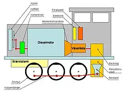 The important components of diesel–electric propulsion are the diesel engine (also known as the prime mover), the main generator/alternator-rectifier, traction motors (usually with four or six axles), and a control system consisting of the engine governor and electrical or electronic components, including switchgear, rectifiers and other components, which control or modify the electrical supply to the traction motors. In the most elementary case, the generator may be directly connected to the motors with only very simple switchgear.