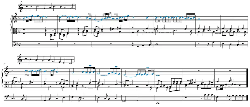 The preludes are quite varied in style and structure, and are therefore hard to categorize, as no two praeludia are alike.[3] The texture of Buxtehude's praeludia can be described as either free or fugal.[12] They consist of strict diatonic harmony and secondary dominants.[12] Structure-wise, there is usually an introductory section, a fugue and a postlude, but this basic scheme is very frequently expanded: both BuxWV 137 and BuxWV 148 include a full-fledged chaconne along with fugal and toccata-like writing in other sections, BuxWV 141 includes two fugues, sections of imitative counterpoint and parts with chordal writing. Buxtehude's praeludia are not circular, nor is there a recapitulation. A fugal theme, when it recurs, does so in a new, changed way.[12] A few pieces are smaller in scope; for example, BuxWV 144, which consists only of a brief improvisatory prelude followed by a longer fugue. The sections may be explicitly separated in the score or flow one into another, with one ending and the other beginning in the same bar. The texture is almost always at least three-voice, with many instances of four-voice polyphony and occasional sections in five voices (BuxWV 150 being one of the notable examples, with a five-voice structure in which two of the voices are taken by the pedal).