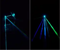 In optics, a diffraction grating is a grating with a periodic structure of appropriate scale so as to diffract light, or another type of electromagnetic radiation, into several beams traveling in different directions (i.e., different diffraction angles) known as diffracted orders. The emerging coloration is a form of structural coloration.[1][2] The directions or diffraction angles of these beams depend on the wave (light) incident angle to the diffraction grating, the spacing or periodic distance between adjacent diffracting elements (e.g., parallel slits for a transmission grating) on the grating, and the wavelength of the incident light. Because the grating acts as a dispersive element, diffraction gratings are commonly used in monochromators and spectrometers, but other applications are also possible such as optical encoders for high-precision motion control[3] and wavefront measurement.[4][5]