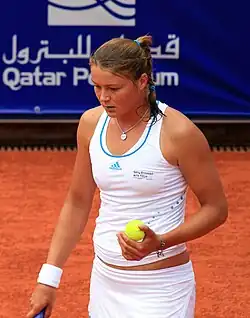 At the French Open, Safina made the quarterfinals at a Grand Slam for the first time in her career. In the fourth round, she defeated fourth-seeded Maria Sharapova.[31] In the third set, she trailed 1–5 and was down a match point but won after almost 2½ hours of play. She went on to lose to Kuznetsova in the next round.[32] To kick off the grass court season, she reached her first grass court final at 's-Hertogenbosch, losing to Michaëlla Krajicek.[33] She then lost in the third round of Wimbledon, losing to Ana Ivanovic.