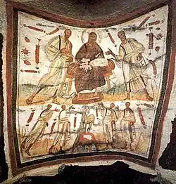 On 23 February 303, Diocletian ordered that the newly built church at Nicomedia be razed. He demanded that its scriptures be burned, and seized its precious stores for the treasury.[188] The next day, Diocletian's first "Edict against the Christians" was published.[189] The edict ordered the destruction of Christian scriptures and places of worship across the empire, and prohibited Christians from assembling for worship.[190] Before the end of February, a fire destroyed part of the Imperial palace.[191] Galerius convinced Diocletian that the culprits were Christians, conspirators who had plotted with the eunuchs of the palace. An investigation was commissioned, but no responsible party was found. Executions followed anyway, and the palace eunuchs Dorotheus and Gorgonius were executed. One individual, Peter Cubicularius, was stripped, raised high, and scourged. Salt and vinegar were poured in his wounds, and he was slowly boiled over an open flame. The executions continued until at least 24 April 303, when six individuals, including the bishop Anthimus, were decapitated.[192] A second fire occurred sixteen days after the first. Galerius left the city for Rome, declaring Nicomedia unsafe.[191] Diocletian would soon follow.[192]