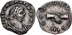 Far more probable, according to the archaeological evidence, is that Carausius had held some important military post in Britain,[88] already had a firm basis of power in Britain and Northern Gaul, and profited from the lack of legitimacy of the central government.[89] Carausius strove to have his legitimacy as a junior emperor acknowledged by Diocletian: in his coinage, he extolled the "concord" between him and the central power. One bronze piece from 290 read PAX AVGGG, "the Peace of the three Augusti"; on the other side, it showed Carausius together with Diocletian and Maximian, with the caption CARAVSIVS ET FRATRES SVI, "Carausius & his brothers".[90][91] Diocletian could not allow a breakaway regional usurper following in Postumus's footprints to enter, of his own accord, the imperial college.[92]