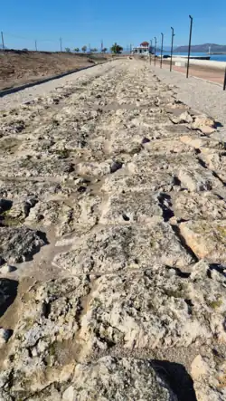 Today, erosion caused by ship movements on the nearby Canal has left considerable portions of the Diolkos in a poor state, particularly at its excavated western end. Critics who blame the Greek Ministry of Culture for continued inactivity have launched a petition to save and restore the registered archaeological site.[54][55] Restoration work was performed in October 2024 to shore up the canal bank where the edge of the Diolkos was eroding into the canal. The Diolkos itself was then surrounded by earth and stone edging, sidewalks with gravel edging to discourage walking directly on the Diolkos (apparently) and streetlights. This surround and walkway is on both sides of the road at the western end of the canal, east of the lowering-bridge. The works were still curing on 20 October 2024, and roped-off from foot traffic. As of July 2025 the footpath alongside the stretch of the Diolkos is open. The nearby road and curb are built up to prevent vehicle traffic on the surface.