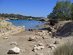 The Diolkos ran across the narrowest part of the Isthmus, where the trackway followed the local topography in a curved course in order to avoid steeper gradients.[25] The roadway passed the Isthmus ridge at c. 79 m (259 ft) height with an average gradient of 1:70 (a 1.43% grade),[25] while the steepest sections rose at a gradient of 1:16.5 (a 6% grade).[26] Its total length is estimated at 6–7 km (3.7–4.3 mi),[26] 8 km (5 mi)[25] or 8.5 km (5.3 mi)[27] depending on the number of supposed bends taken into account. A total of 1,100 m (3,609 ft) has been archaeologically traced, mainly at its western end close to the Bay of Corinth.[25] There the known trackway began at a mooring place south of the more recent canal and ran parallel to the waterway for a few hundred meters, after which it switched to the north side, running in a slight bend a similar distance along the canal.[28] From there on, the Diolkos either followed in a straight line the course of the modern canal,[29] or swung south in a wide arc.[30] The roadway ended at the Saronic Gulf at the village Schoinos, modern-day Kalamaki, described by Strabo as the trackway's eastern terminal.[25] Sections of the Diolkos have been destroyed by the 19th-century Corinth Canal[27] and other modern installations.[31]