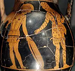 When the sacrifice of Iphigenia (Agamemnon's daughter) became a necessity for the Achaeans to sail away from Aulis, King Agamemnon had to choose between sacrificing his daughter and resigning from his post of high commander among Achaeans. When he decided to sacrifice his daughter to Artemis, Odysseus carried out this order of Agamemnon by luring Iphigenia from Mycenae to Aulis, where murder, disguised as wedding, awaited her.[18] According to Hyginus, Diomedes went with Odysseus to fetch Iphigenia, making this the two companions' first mission together.[19] However, Pseudo-Apollodorus has Agamemnon send Odysseus and Talthybius instead.[20] According to Euripides, neither of the two went to fetch Iphigenia, though he calls the plan Odysseus' idea in Iphigenia at Tauris.[21]