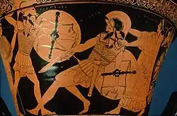 He was born to Tydeus and Deipyle and later became King of Argos, succeeding his maternal grandfather, Adrastus. In Homer's Iliad Diomedes is regarded alongside Ajax the Great and Agamemnon, after Achilles, as one of the best warriors of all the Achaeans in prowess.[2] After the Trojan War he is said to have founded ten or more Italian cities[3][4] and, after his death, was worshiped as a divine being in both Italy and Greece.[5][6]