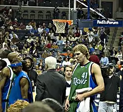 Projected to be the seventh pick in the 1998 NBA draft, Nowitzki passed up many college offers and went directly into the NBA as a prep-to-pro player.[29] The Milwaukee Bucks selected Nowitzki with the ninth pick in the draft and traded him to the Dallas Mavericks in a multi-team deal; future star point guard Steve Nash came to Dallas in the same trade.[30] Nowitzki and Nash quickly became close friends.[31] Nowitzki became only the fourth German player in NBA history, following pivots Uwe Blab and Christian Welp and All-Star swingman Detlef Schrempf, who was a 35-year-old veteran of the Seattle SuperSonics when his young compatriot arrived. Nowitzki finished his DJK career as the only Würzburg player to have ever made the NBA.[32] Nowitzki was unable to continue to wear his No. 14 jersey with the Mavericks because Robert Pack was already wearing it, so he swapped the digits and wore No. 41 instead.[22]