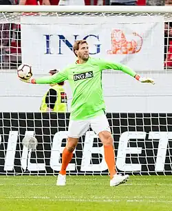 When Nowitzki joined the team, DJK played in Germany's second-tier level league, the Second Bundesliga, South Division. His first trainer was Pit Stahl, who played the tall teenager as an outside-scoring forward rather than an inside-scoring center to use his shooting skills.[21] Nowitzki chose to wear the jersey number 14 because Charles Barkley wore that number during the 1992 Olympics.[22] In the 1994–95 Second Bundesliga season, ambitious DJK finished as a disappointing sixth of 12 teams; the rookie Nowitzki was often benched and struggled with bad school grades, which forced him to study rather than work on his game.[23] In the next 1995–96 Second Bundesliga season, Nowitzki established himself as a starter next to Finnish star forward Martti Kuisma and soon became a regular double-digit scorer. After German national basketball coach Dirk Bauermann saw him score 24 points in a DJK game, he said, "Dirk Nowitzki is the greatest German basketball talent of the last 10, maybe 15 years."[24]