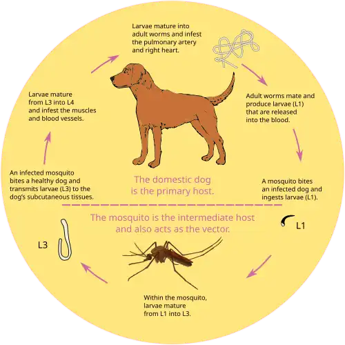 The first larval stage (L1) and second larval stage (L2) of heartworm development occurs within the body of a mosquito. Once the larvae develop into the infective third larval stage (L3), the mosquito locates and bites a host, depositing the larvae under the skin at the site of the bite. After a week or two of further growth, they molt into the fourth larval stage (L4) . Then, they migrate to the muscles of the chest and abdomen, and 45 to 60 days after infection, molt to the fifth stage (L5, immature adult). Between 75 and 120 days after infection, these immature heartworms then enter the bloodstream and are carried through the heart to reside in the pulmonary artery. Over the next three to four months, they increase greatly in size. The female adult worm is about 30 cm in length, and the male is about 23 cm, with a coiled tail.[15] By seven months after infection, the adult worms have mated and the females begin giving birth to live young, called microfilariae. Heartworms can live for 5 to 7 years in a dog.[16]