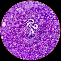 Microfilaria of Dirofilaria immitis (heartworms) in a lymph node of a dog with lymphoma. This baby nematode is in a pillow of intermediate-to-large, immature lymphocytes, exhibiting multiple criteria of cancer.[24]
