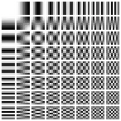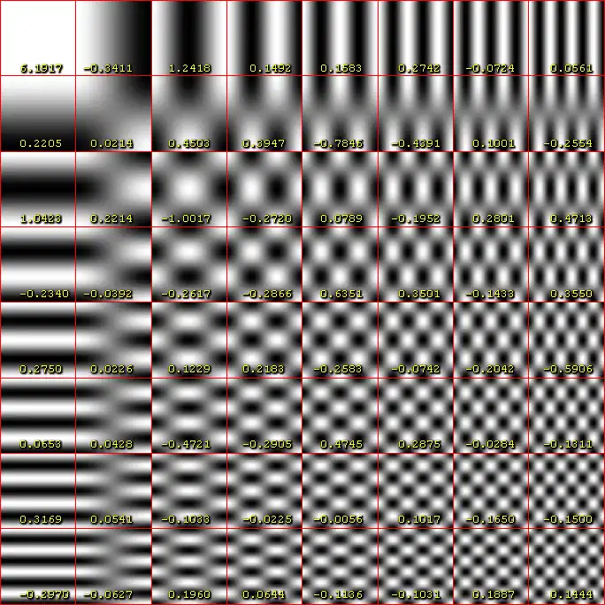 The DCT-II is an important image compression technique. It is used in image compression standards such as JPEG, and video compression standards such as H.26x, MJPEG, MPEG, DV, Theora and Daala. There, the two-dimensional DCT-II of blocks are computed and the results are quantized and entropy coded. In this case, is typically 8 and the DCT-II formula is applied to each row and column of the block. The result is an 8 × 8 transform coefficient array in which the element (top-left) is the DC (zero-frequency) component and entries with increasing vertical and horizontal index values represent higher vertical and horizontal spatial frequencies.