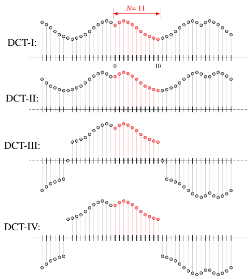 Illustration of the implicit even/odd extensions of DCT input data, for N=11 data points (red dots), for the four most common types of DCT (types I-IV). Note the subtle differences at the interfaces between the data and the extensions: in DCT-II and DCT-IV both the end points are replicated in the extensions but not in DCT-I or DCT-III (and a zero point is inserted at the sign reversal extension in DCT-III).