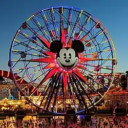 ![]() ![]() Two icons of the Disneyland Resort: Sleeping Beauty Castle at Disneyland Park and the Pixar Pal-A-Round at Disney California Adventure. | |