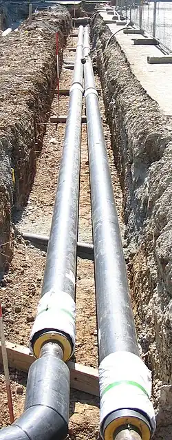 A fifth-generation district heating and cooling network (5GDHC),[18] also called cold district heating, distributes heat at near ambient ground temperature: this in principle minimizes heat losses to the ground and reduces the need for extensive insulation. Each building on the network uses a heat pump in its own plant room to extract heat from the ambient circuit when it needs heat, and uses the same heat pump in reverse to reject heat when it needs cooling. In periods of simultaneous cooling and heating demands this allows waste heat from cooling to be used in heat pumps at those buildings which need heating.[19] The overall temperature within the ambient circuit is preferably controlled by heat exchange with an aquifer or another low temperature water source to remain within a temperature range from 10 °C to 25 °C.