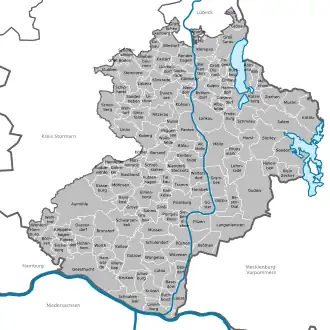 The district's territory comprises most of the former Duchy's territory north of the river Elbe, except of the Amt Neuhaus. All the former Saxe-Lauenburgian areas beyond the Elbe belong today to the Lower Saxon districts of Cuxhaven (Land of Hadeln), Harburg and Lüneburg.
