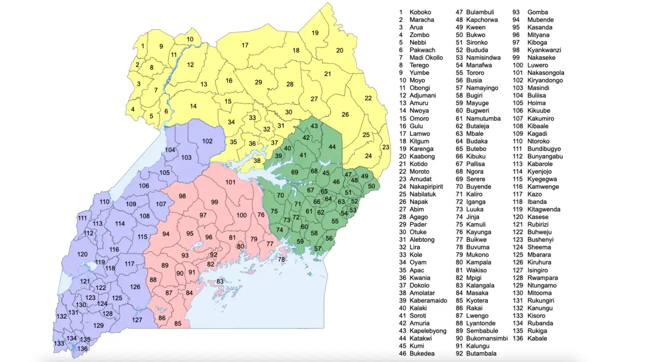 As of 1 July 2020, Uganda is divided into 135 districts plus the capital city of Kampala , which are grouped into four geographic regions.[ 1] [ 2]