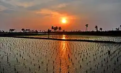 Tropic of Cancer (23°30' N latitude) passes through five Districts of West Bengal. Divisions are administered by Divisional Commissioners.[9] Kolkata, the capital of the state, constitutes the Kolkata district. Other districts are further divided into administrative units such as subdivisions and blocks, administered by SDO and BDO, respectively. The Panchayati Raj has a three-tier structure in the state. The atomic unit is called a Gram Panchayat, which is the Panchayat organisation for a collection of villages.[10] The block-level organisations are called Panchayat Samiti,[11] and the district-level organisations are named Zilla Parishad.[12]