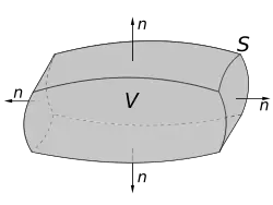 Suppose V is a subset of (in the case of n = 3, V represents a volume in three-dimensional space) which is compact and has a piecewise smooth boundary S (also indicated with ). If F is a continuously differentiable vector field defined on a neighborhood of V, then:[4][5]