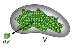 This principle applies to a volume divided into any number of parts, as shown in the diagram.[7] Since the integral over each internal partition (green surfaces) appears with opposite signs in the flux of the two adjacent volumes they cancel out, and the only contribution to the flux is the integral over the external surfaces (grey). Since the external surfaces of all the component volumes equal the original surface.