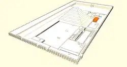 The step pyramid is made of limestone. It is massive and contains only one tight corridor leading to the close midst of the monument, ending in a rough chamber where the entrance to the tomb shaft was hidden. This inner construction was later filled with rubble, for it was of no use anymore. The pyramid was once 62 metres high and had a base measurement of c. 125 × 109 metres. It was tightly covered in finely polished, white limestone.[24]