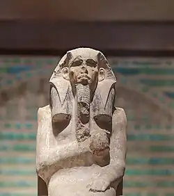 The statue of Djoser is walled into the serdab. The main purpose of the statue was to allow the king to manifest himself and be able to see the rituals performed in and out the serdab. This painted statue is plastered and made out of limestone. Each characteristic of the statue represents something, the striated tripartite wig he is wearing assimilates him to the living world as a dead king. The striped head cloth that covers the wig was used to cover all of his hair. This was a ritual that began to be used by kings in the fourth dynasty. The body is wrapped under a long robe, his hands are placed in a specific way. His right arm is horizontally displayed on his chest while his left arm is resting on his thigh. The placement of his arms are a resemblance to Khasekhem seat.[26][27] One of the oldest representations of the Nine bows, and the first representation of the nine bows fully developed, is on the seated statue of Pharaoh Djoser. His feet rest upon part of the nine bows, which may have referred to Nubians during his reign because of their use of bows and arrows.[28]