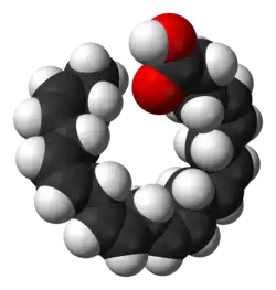 Structurally, DHA is a carboxylic acid (-oic acid) with a 22-carbon chain (docosa- derives from the Ancient Greek for 22) and six (hexa-) cis double bonds (-en-);[6] with the first double bond located at the third carbon from the omega end.[7] Its trivial name is cervonic acid (from the Latin word cerebrum for "brain"), its systematic name is all-cis-docosa-4,7,10,13,16,19-hexa-enoic acid.