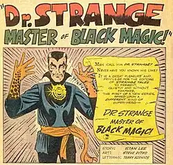 Doctor Strange debuted in Strange Tales #110 (July 1963),[7] a split book shared with the feature "The Human Torch". Doctor Strange appeared in issues #110–111 and #114 before the character's eight-page origin story in #115 (December 1963). His origin was later retold in Doctor Strange #169 (February 1968). Scripter Lee's take on the character was inspired by the Chandu the Magician radio program that aired on the Mutual Broadcasting System in the 1930s.[8] He had Doctor Strange accompany spells with elaborate artifacts, such as the "Eye of Agamotto" and the "Wand of Watoomb", as well as mystical-sounding vocabulary such as "Hoary Hosts of Hoggoth!".[9] Although these often referenced the names of established mythological beings, Lee has said he never had any idea what the incantations meant and used them simply because they sounded mystical and mysterious.[10] Ditko showcased surrealistic mystical landscapes and increasingly vivid visuals that helped make the feature a favorite of college students at the time. Comics historian Mike Benton wrote: