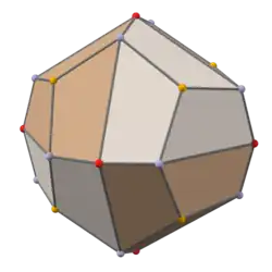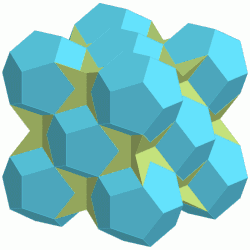 The rhombic dodecahedron is a Catalan solid with twelve rhombic faces and octahedral symmetry. It is dual to the cuboctahedron, an Archimedean solid,[14] and occurs in nature as a crystal form. The rhombic dodecahedron packs together to fill space with centrally symmetric faces, a zonohedron.[15]