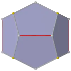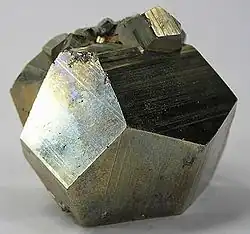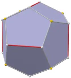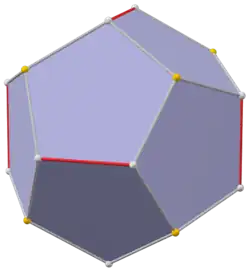 A pyritohedron (or pentagonal dodecahedron) is a dodecahedron with pyritohedral symmetry Th. Like the regular dodecahedron, it has twelve identical pentagonal faces, with three meeting in each of the 20 vertices. However, the pentagons are not constrained to be regular, and the underlying atomic arrangement has no true fivefold symmetry axis. Its 30 edges are divided into two sets, containing 24 and 6 edges of the same length. The only axes of rotational symmetry are three mutually perpendicular twofold axes and four threefold axes.[8]