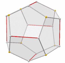 The rhombic dodecahedron can be seen as a degenerate pyritohedron where the 6 special edges have been reduced to zero length, reducing the pentagons into rhombic faces.