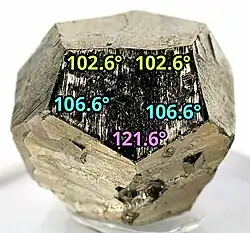 The name crystal pyrite comes from one of the two common crystal habits shown by pyrite (the other one being the cube). In pyritohedral pyrite, the faces have a Miller index of (210), which means that the dihedral angle is 2·arctan(2) ≈ 126.87° and each pentagonal face has one angle of approximately 121.6° in between two angles of approximately 106.6° and opposite two angles of approximately 102.6°. The following formulas show the measurements for the face of a perfect crystal (which is rarely found in nature).