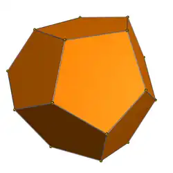 The regular dodecahedron is a convex polyhedron with regular pentagonal faces, three meeting at each vertex. It has 12 faces, 30 edges, and 20 vertices.[4] It is one of the five regular Platonic solids, named after Plato who described them and considered the other four to symbolize the classical elements; he assigned the regular dodecahedron to the cosmos.[5] Its dual is the regular icosahedron.[6]