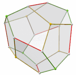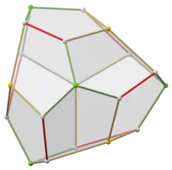 Another important rhombic dodecahedron, the Bilinski dodecahedron, has twelve faces congruent to those of the rhombic triacontahedron, i.e. the diagonals are in the ratio of the golden ratio. It is also a zonohedron and was described by Bilinski in 1960.[16] This figure is another spacefiller, and can also occur in non-periodic spacefillings along with the rhombic triacontahedron, the rhombic icosahedron, and rhombic hexahedra.[17]