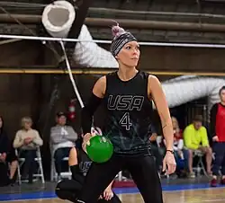 Azalea Donche, preparing to counter at the World Dodgeball Championships in Los Angeles in 2018