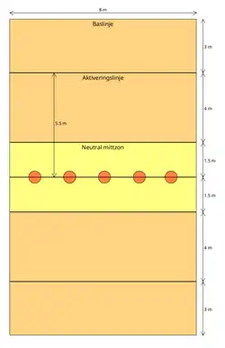 Dodgeball can be played on any surface that has clearly marked boundaries and a center line, such as a basketball or volleyball court or fenced area. Elite Dodgeball specifies a court 50 feet (15 m) by 25 feet (7.6 m), where a zone 10 feet (3.0 m) wide at the junction of the areas is a neutral zone.[4]