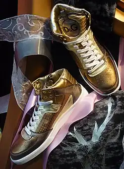 During this time, Dolce & Gabbana drew inspiration from the sport of football, and their designs continued to influence trends in both fashion and music.[24][35] From 2004 to 2014, the brand worked with AC Milan to produce the team's official off-field suits.[36][37] In 2002, their early corset designs were revived by many European designers as a trend.[38] The brand also began holding private viewings of their new collections for buyers to pre-empt the copying of their designs by fast fashion companies.[39]