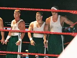 At the same time as their feud with DX and their alignment with McMahon, the Spirit Squad also wrestled other teams in Raw's tag division over their World Tag Team Championship, successfully defending the championship against the teams of Jim Duggan and Eugene, Charlie Haas and Viscera, and Snitsky and Val Venis.[31] They then entered a lengthy feud with The Highlanders, whom they eventually defeated to retain the championship at the Unforgiven pay-per-view on September 17.[34][35] The Spirit Squad as a whole later began a losing streak with separate members losing singles matches to Ric Flair on consecutive episodes of Raw, until Kenny managed to defeat him on the October 23 episode.[36][37][38][39][40] It was then announced that Flair and a WWE legend, selected by interactive voting, would wrestle the team for the World Tag Team Championship at Cyber Sunday.[40] The fans chose Roddy Piper, and he and Flair defeated Kenny and Mikey to win the championship at the event on November 5.[41]