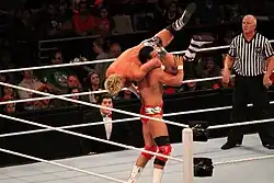 At Capitol Punishment, Ziggler defeated Kingston via a sleeper hold submission to earn his first WWE United States Championship.[89][90][91] The next night on Raw, Kingston invoked his rematch clause in a two out of three falls match and won via disqualification, allowing Ziggler to retain. After Jack Swagger suggested to Vickie Guerrero that she should manage him in addition to Ziggler, a jealous Ziggler teased tension with Swagger.[92][93] This, coupled with Ziggler's concurrent feud with Alex Riley, led Ziggler to defend and retain his United States Championship in a fatal four-way match against Swagger, Riley, and John Morrison at Night of Champions on September 18.[94] On the following episode of Raw SuperShow, Ziggler lost a non-title match to Zack Ryder when guest star Hugh Jackman helped Ryder by punching Ziggler in the face.[95] Although Ziggler later claimed to have a broken jaw due to Jackman's punch, it was reported that the supposed injury was fake.[96] Later that night, Guerrero officially began managing Swagger, and Swagger began interfering in Ziggler's matches to help him win.[97] Ziggler and Swagger unsuccessfully challenged Air Boom for the WWE Tag Team Championship at Hell in a Cell on October 2 and at Vengeance on October 23, where Ziggler also successfully defended the United States Championship against Ryder.[98][99] He went on to successfully defend the championship against Morrison at Survivor Series on November 20.[100] At TLC: Tables, Ladders and Chairs on December 18, Ziggler lost the United States Championship to Ryder, ending his reign at 182 days.[101]