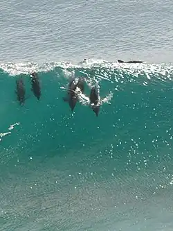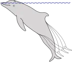 Dolphins frequently leap above the water surface, this being done for various reasons. When travelling, jumping can save the dolphin energy as there is less friction while in the air.[126] This type of travel is known as porpoising.[126] Other reasons include orientation, social displays, fighting, non-verbal communication, entertainment and attempting to dislodge parasites.[127][128]