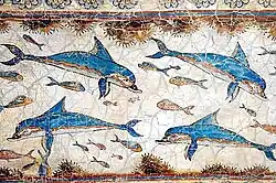 The name is originally from Greek δελφίς (delphís), "dolphin",[2] which was related to the Greek δελφύς (delphus), "womb".[2] The animal's name can therefore be interpreted as meaning "a 'fish' with a womb".[3] The name was transmitted via the Latin delphinus[4] (the romanization of the later Greek δελφῖνος – delphinos[2]), which in Medieval Latin became dolfinus and in Old French daulphin, which reintroduced the spelling ph into the word dolphin. The term mereswine ("sea pig") is also used.[5][6]