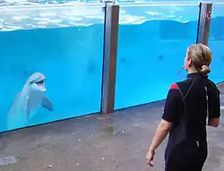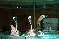 A dolphinarium is an aquarium for dolphins. The dolphins are usually kept in a pool, though occasionally they may be kept in pens in the open sea, either for research or public performances. Some dolphinariums (sometimes called dolphinaria in plural[1]) consist of one pool where dolphins perform for the public, others are part of larger parks, such as marine mammal parks, zoos or theme parks, with other animals and attractions as well.