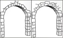 Unlike voussoir arches, which require support for each element until the keystone is in place, domes are stable during construction as each level is made a complete and self-supporting ring.[4] The upper portion of a masonry dome is always in compression and is supported laterally, so it does not collapse except as a whole unit and a range of deviations from the ideal in this shallow upper cap are equally stable.[40] Because voussoir domes have lateral support, they can be made much thinner than corresponding arches of the same span. For example, a hemispherical dome can be 2.5 times thinner than a semicircular arch, and a dome with the profile of an equilateral arch can be thinner still.[41]