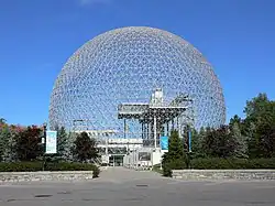 Geodesic domes are the upper portion of geodesic spheres. They are composed of a framework of triangles in a polyhedron pattern.[81] The structures are named for geodesics and are based upon geometric shapes such as icosahedrons, octahedrons or tetrahedrons.[81][4] Such domes can be created using a limited number of simple elements and joints and efficiently resolve a dome's internal forces. Their efficiency is said to increase with size.[82] Although not first invented by Buckminster Fuller, they are associated with him because he designed many geodesic domes and patented them in the United States.[83]